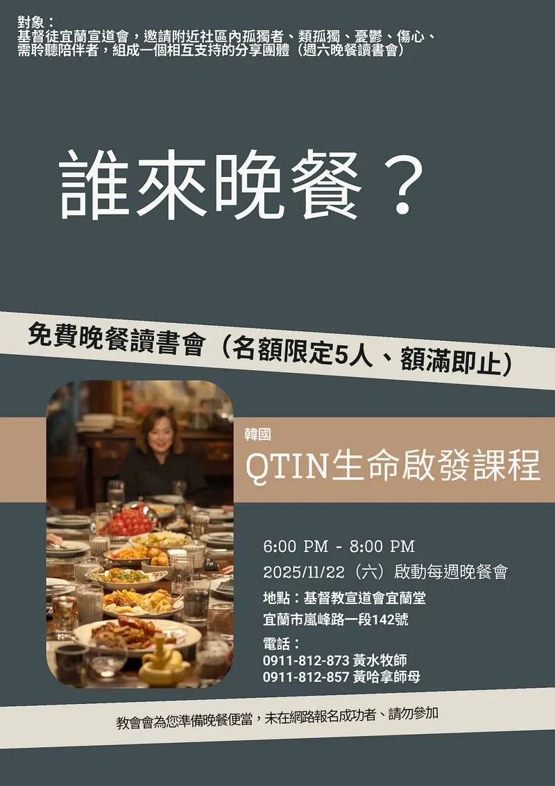 宣道會宜蘭堂表示,「誰來晚餐?」並非一般聚餐活動,而是一場生命同行的邀請。透過共享晚餐與讀書分享,陪伴那些感到孤單、憂鬱或在人際中迷失的朋友。