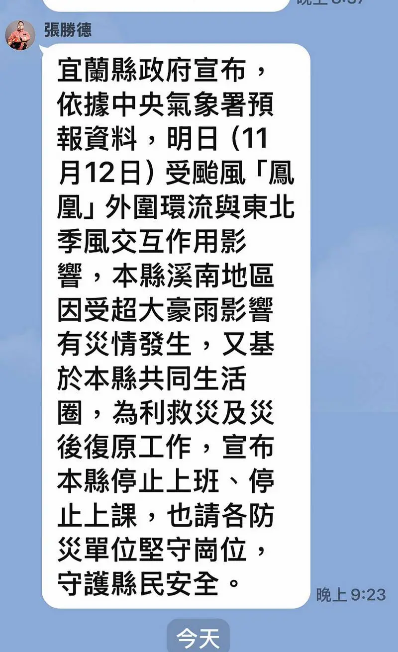 直到晚間21時13分,縣府正式發布全縣停班停課訊息,21時23分張勝德隨即在網路上張貼縣府公告,強調以官方資訊為準。