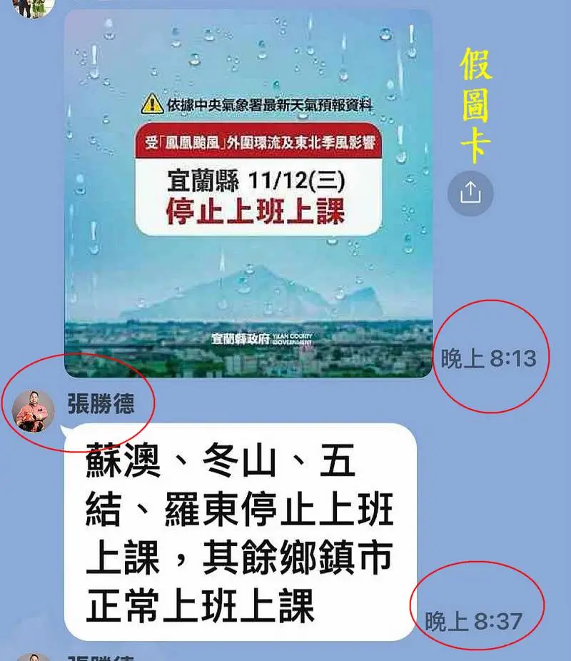 晚間20時13分,議長張勝德收到「假圖卡」訊息後,隨即於20時37分在群組中澄清:「目前僅蘇澳、冬山、五結、羅東停班停課,其餘鄉鎮正常上班上課。」
