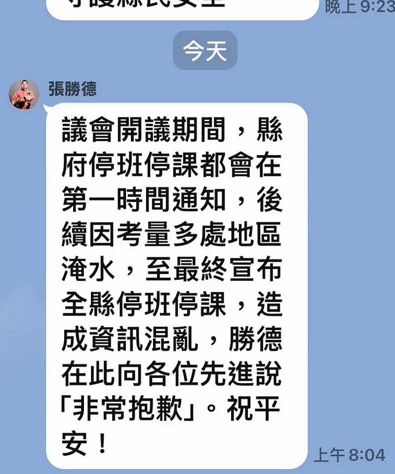 今日上午8時,張勝德再於社群平台發文說明,指出議會開議期間,若縣府宣布停班停課,議會都會同步接獲通知;此次因豪雨擴大、決策過程反覆,造成資訊延遲與混亂,他向各界表達歉意,並祝大家平安。