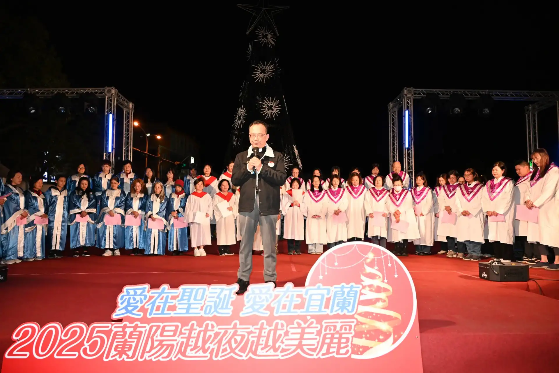 今年活動由縣府再次攜手宜蘭縣基督徒聯禱會與全福關懷協會,以「2025愛在聖誕・愛在宜蘭」為主題串連系列活動。代理縣長林茂盛、縣議會議長張勝德、牧者及社福團體代表共同啟動耶誕樹及周邊燈景,吸引許多民眾到場見證溫馨亮燈時刻。