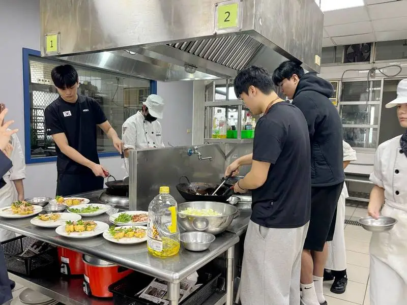 餐飲管理科則安排料理體驗課程,讓韓國學生親手製作具宜蘭風味的特色餐點。在師生協同下,來賓不僅認識地方飲食文化,也更直接理解技職教育的課程實作與專業訓練。