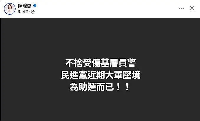 民眾黨提名宜蘭縣長候選人陳琬惠,只在臉書上貼了一張黑底的圖片,上面用白色字體寫著~「不舍受傷基層員警.民進黨近期大軍壓境.為助選而已!!」