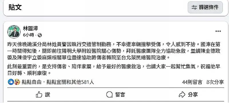 「昨天傍晚礁溪分局林姓員警因執行交通管制勤務,不幸遭車輛撞擊受傷,令人感到不捨。國漳在第一時間得知後,隨即前往陽明大學附設醫院關心傷勢,拜託醫療團隊全力協助急救,並請陳金德政委及陳俊宇立委麻煩相關單位盡速協助將傷者轉院至台北榮民總醫院治療。