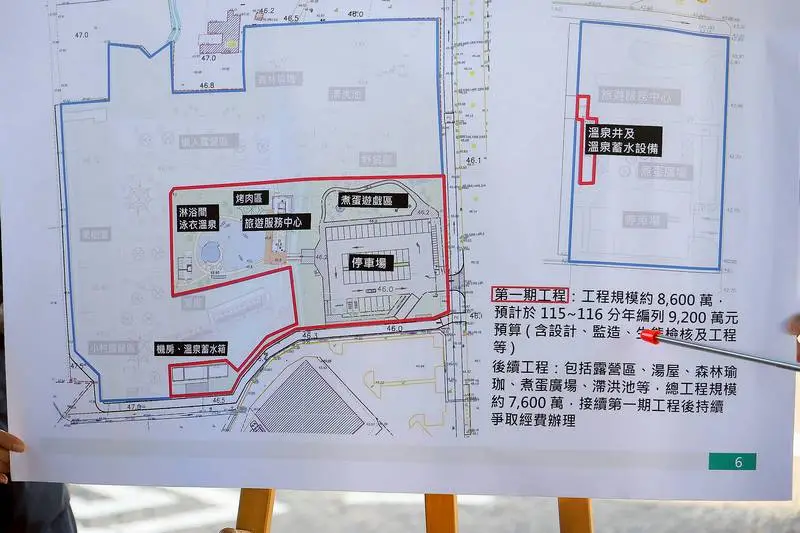 未來縣府將於115至116年推動「第一期工程」,總計畫經費9,200萬元,其中115年度編列2,230萬元,整體第一期工程規模約8,600萬元,並同步向中央爭取補助。工程內容包含旅遊服務中心、泳衣溫泉池及淋浴區、生態景觀與植栽配置、地坪鋪面、滯洪及出流管制等基礎設施,以及停車空間等配套,打造舒適友善的遊客設施。