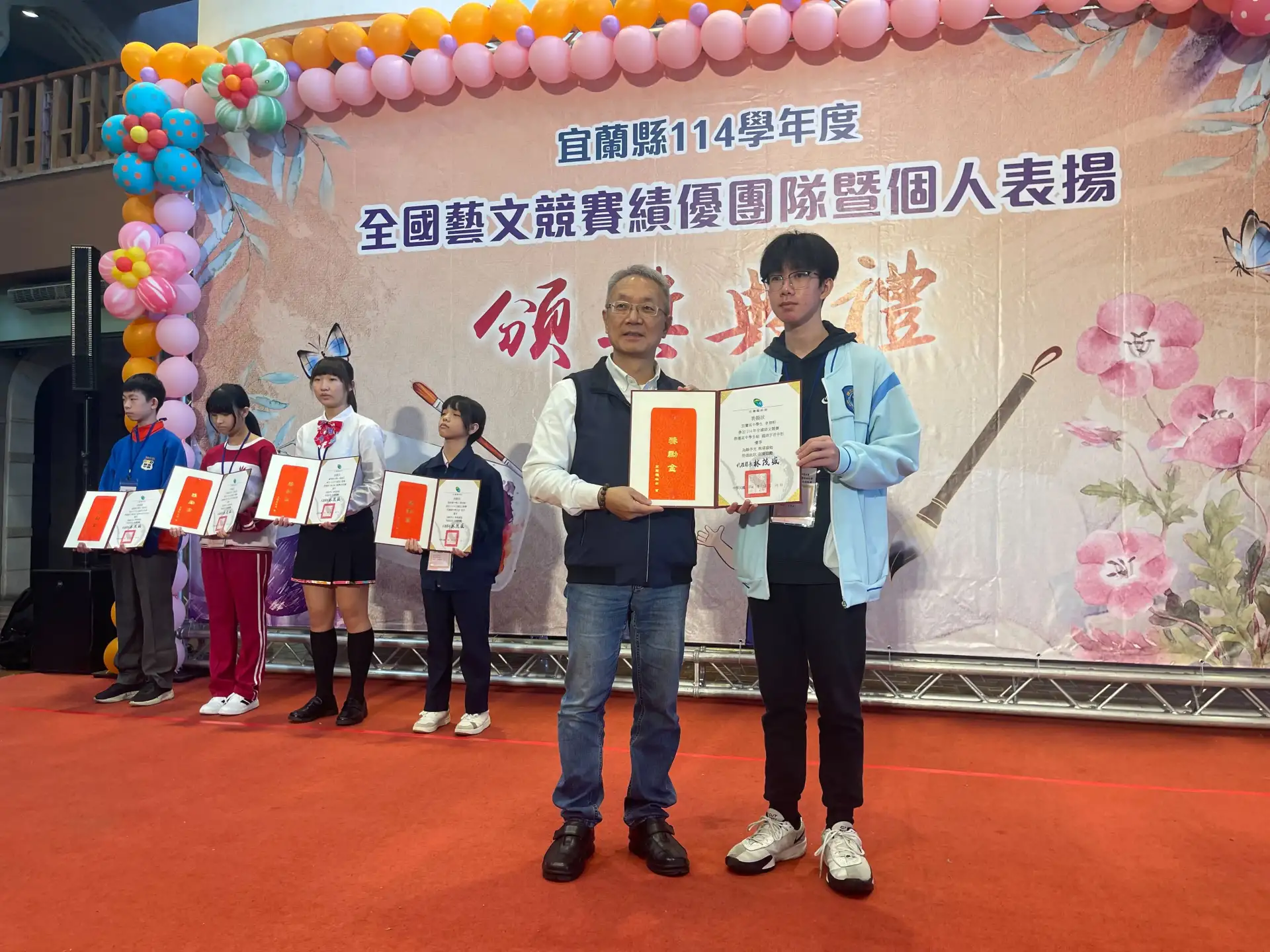 在全國學生美術比賽方面,宜蘭縣學生同樣表現搶眼。國小組繪畫類由成功國小與中山國小學生脫穎而出,國中組平面設計亦獲特優佳績,展現豐沛的創作能量。其中,成功國小呂暐晟同學從去年的佳作進步至今年勇奪特優,清楚呈現一年來累積的努力與成長,令人印象深刻。