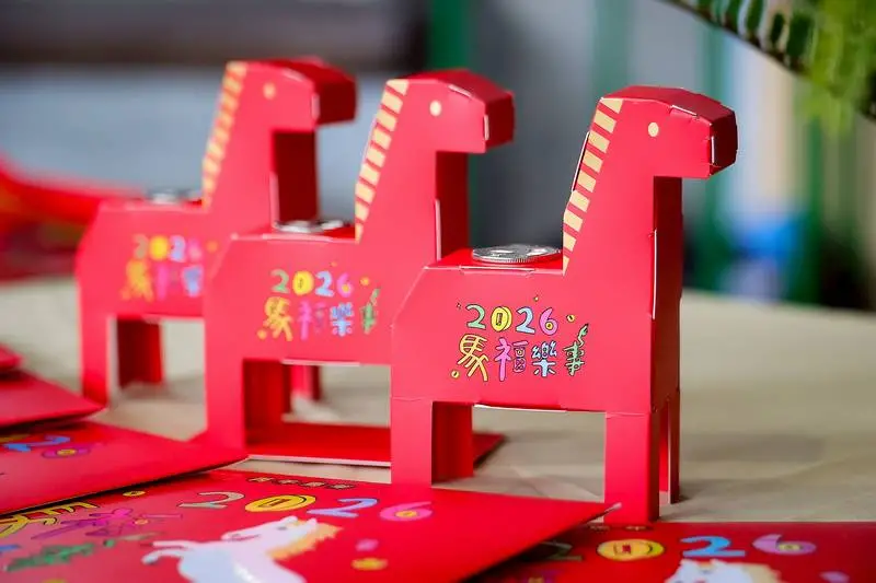 馬年紀念紅包與春聯的設計由成功國小美術班學生共同創作,透過童趣視角與藝術能量,描繪出色彩繽紛、奔馳向前的白馬意象。紀念紅包融入立體馬造型與存錢筒功能,讓民眾可親手DIY摺出象徵財源滾滾的紅包存錢筒,傳達「福氣在路上、馬上有錢、好事接連來」的新年祝福,讓傳統年俗更添創意與趣味。