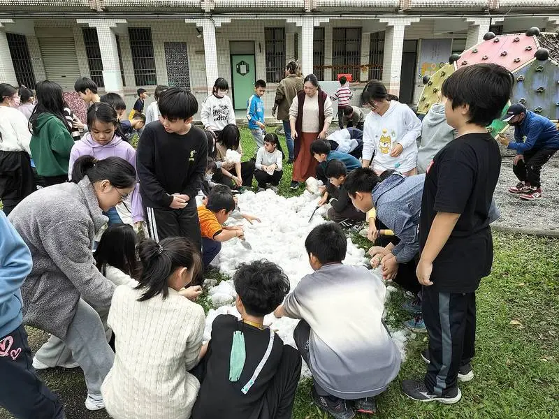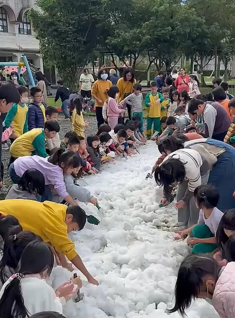 這場別具意義的「校園玩雪」活動,不僅讓孩子們近距離接觸難得一見的高山瑞雪,也結合自然觀察與生活教育,在師長引導下,學生實際感受雪的溫度與型態,進一步認識高山氣候與地理環境,讓課堂知識走出書本,化為生動的學習經驗,許多同學都從來未碰過雪,雙手用小鏟子挖雪,一位女同學用小手捏出一個小雪人,有些同學在打雪仗,老師則吩咐同學可以丟向遊樂設施,不要同學互打。