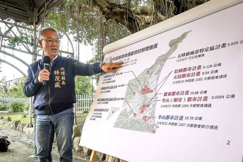 除地價制度調整外,宜蘭縣都市計畫公共設施用地專案通盤檢討亦持續推進。縣府自106年起辦理公開展覽,迄今已檢討全縣19處都市計畫、245處公共設施用地,面積約185公頃,並透過通檢程序變更為住宅區、商業區及產業專用區等可建築用地,搭配市地重劃方式興建基礎設施,地主於分回約55%土地後即可自行開發,實質落實還地於民。