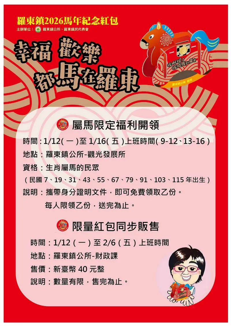 為回饋民眾,羅東鎮公所特別推出「屬馬限定」福利,凡生肖屬馬的民眾(民國7、19、31、43、55、67、79、91、103、115年出生),可於1月12日至1月16日上班時間,攜帶身分證明文件至羅東鎮觀光發展所免費領取馬年紀念紅包乙份,每人限領一份,送完為止。