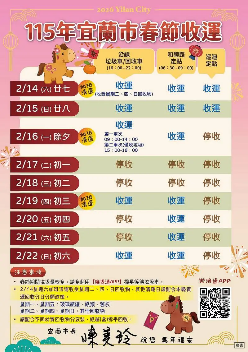 宜蘭市公所公布2026年春節垃圾清運時程,2月16日至2月22日採巡迴定點方式收運,除夕(2月16日)加班收運,初一及初二部分時段停止清運,其餘日子依公告時間正常或加班收運。相關詳細時段已印製通知單,由各里長及鄰長協助發送,民眾也可向垃圾車隨車人員索取,或至宜蘭市公所清潔隊、官方網站下載查詢,並可透過手機安裝「樂圾通APP」即時掌握最新收運資訊。