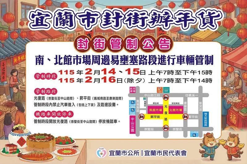 為迎接農曆年節並因應民眾年貨採買需求,宜蘭市公所規劃於2月14日至2月16日,在南、北館市場周邊辦理封街辦年貨活動,透過交通管制措施營造安全、便利且熱鬧的採買環境,邀請鄉親走入傳統市場,感受濃厚的新春氣氛。