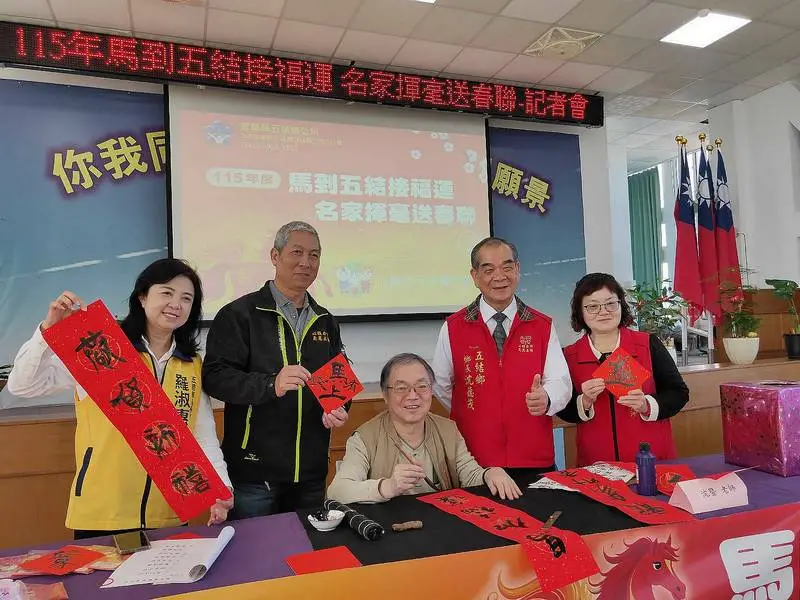 五結鄉公所與宜蘭縣生活美學協會攜手合作,將於115年2月7日上午9時,在五結鄉公所三樓禮堂舉辦「馬到五結接福運 名家揮毫送春聯」活動,特別邀請黃朝松、吳政安、陳佩苓、朱啓仁、沈暨、黃建嵐等6位書法名家現場揮毫,免費致贈350份手寫春聯,並貼心準備紅包袋與暖心湯品,讓鄉親在寒冬中感受滿滿年味與祝福。