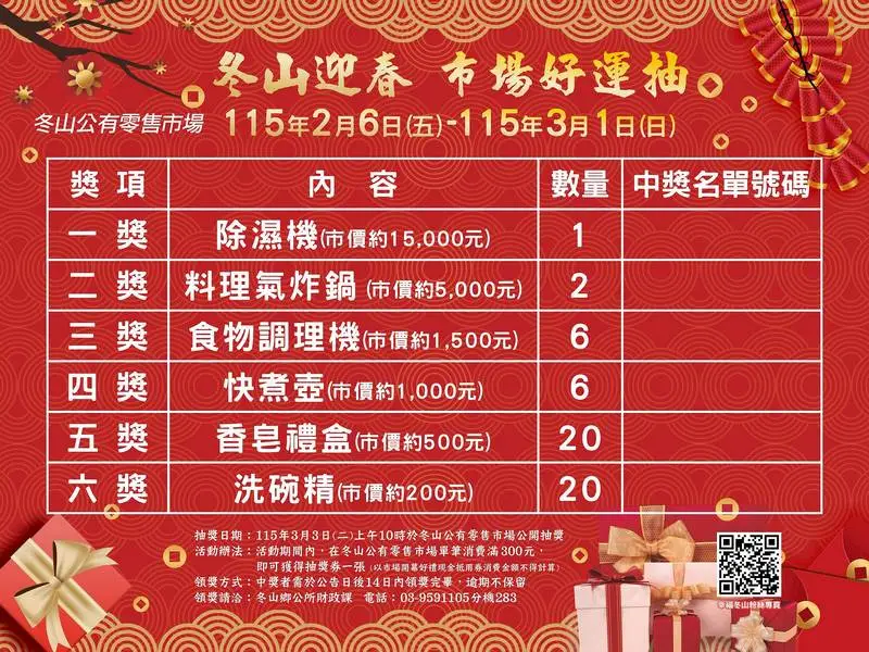 活動期間,民眾凡於冬山公有零售市場單筆消費滿新臺幣300元,即可獲得抽獎券一張(市場開幕好禮現金抵用券之消費金額不列入計算)。抽獎活動將於115年3月3日(星期二)上午10時,在冬山公有零售市場公開舉行,並於3月5日公布中獎名單。