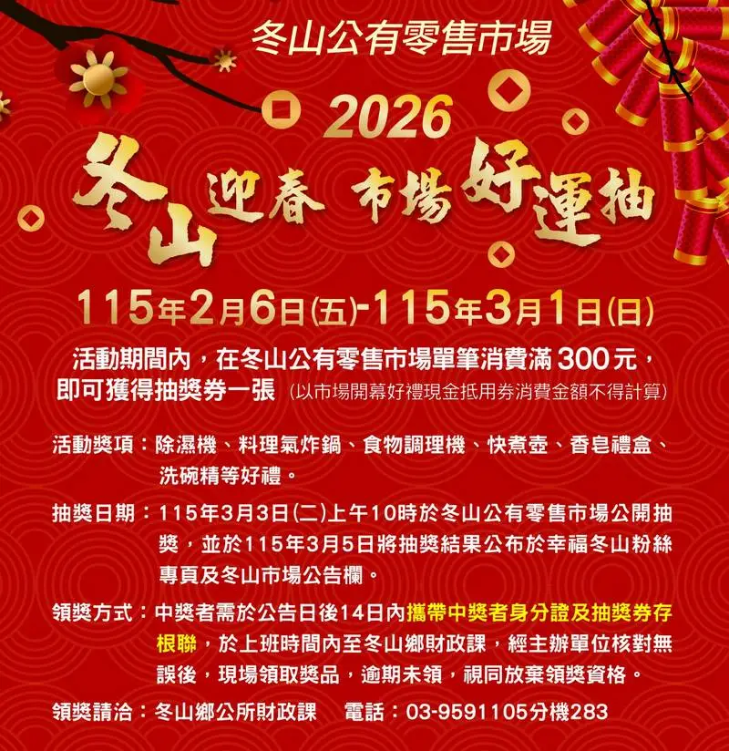 為振興地方經濟、活絡市場消費,並配合冬山公有零售市場正式啟用,冬山鄉公所攜手冬山鄉民代表會推出「冬山迎春・市場好運抽」抽獎活動,自115年2月6日起至3月1日止,邀請民眾走進市場採買年貨與生活用品,以實際行動支持在地攤商,也為新春增添好運氣。
