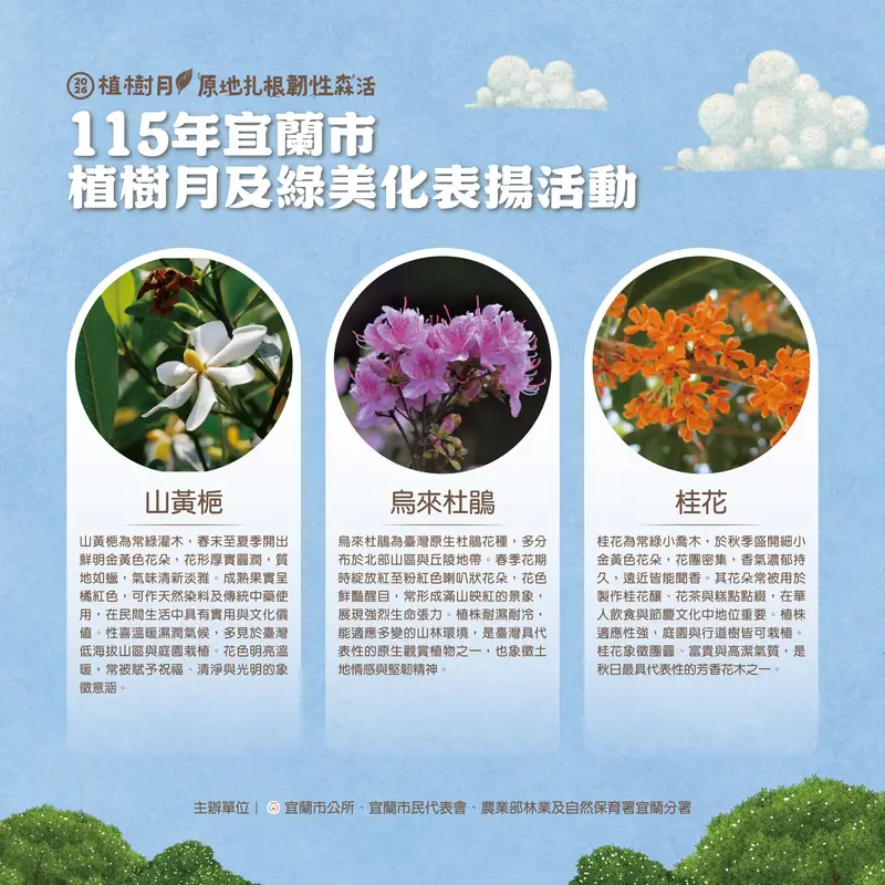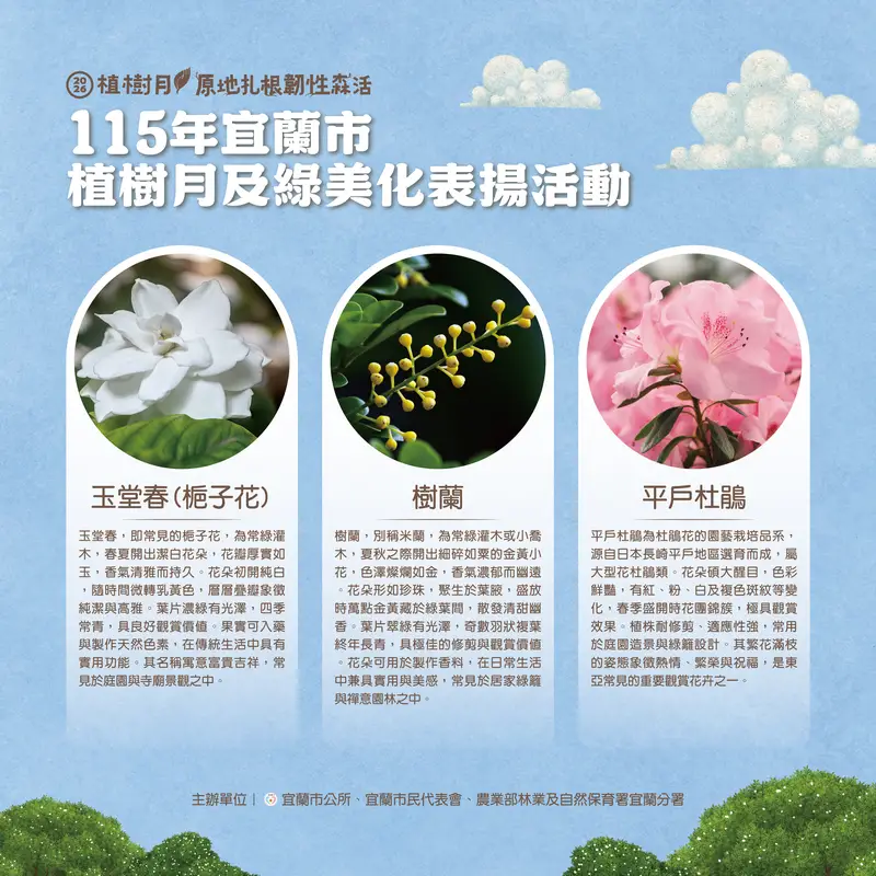 宜蘭市公所與林業及自然保育署再度攜手合作,將於115年3月21日上午9時至12時,在市民之森廣場(宜蘭市公所後方)辦理「115年植樹月及綠美化表揚活動」,邀請民眾一同參與綠意行動,攜手打造永續宜居城市。