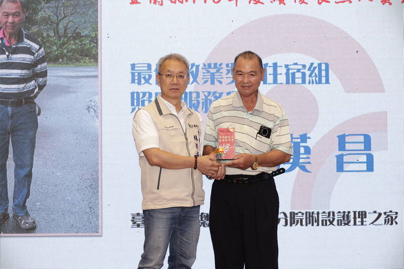 ※少數投入長照服務10年的男性照顧服務員賴漢昌接受縣長表揚並合影