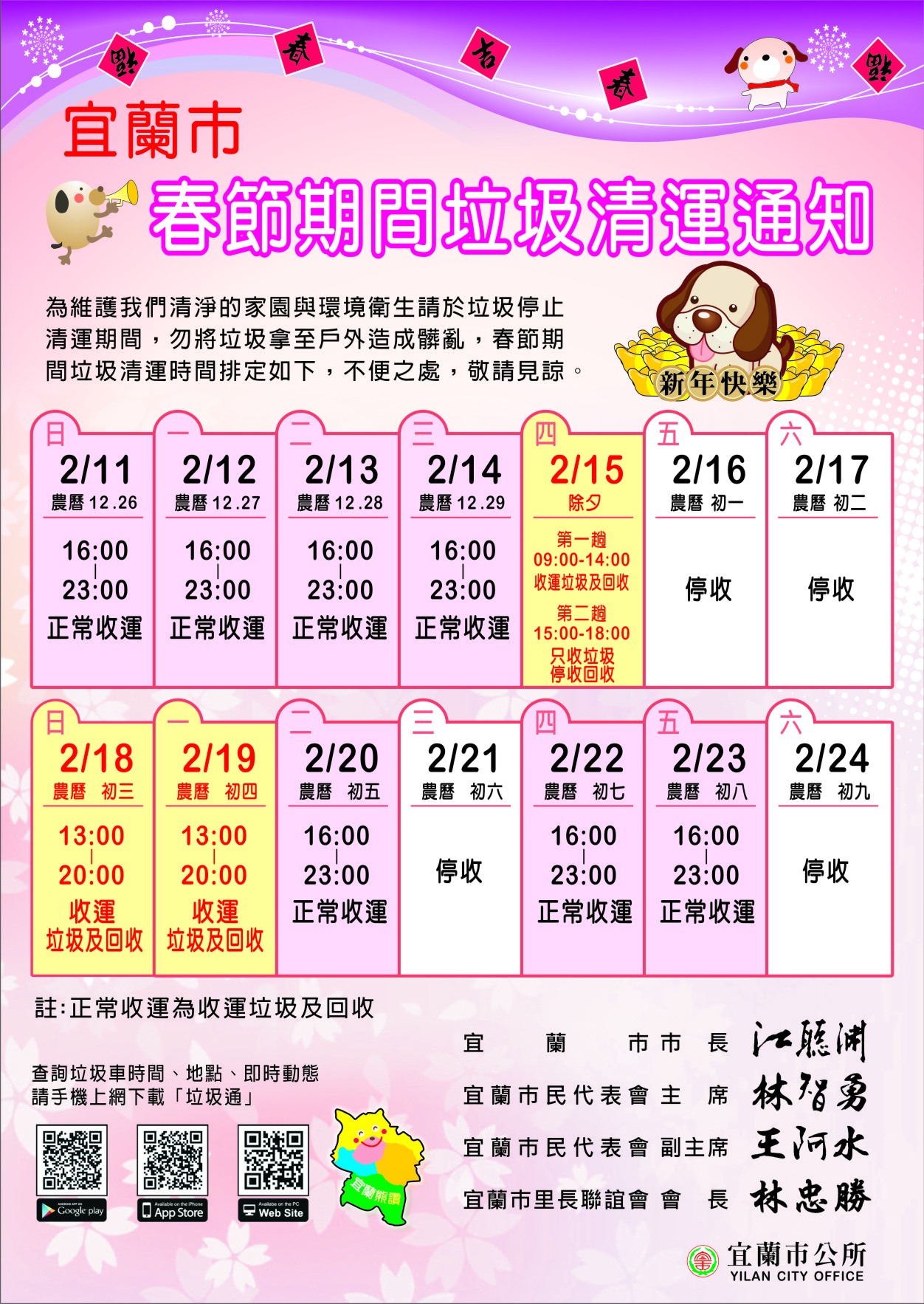 農曆春節雖然將至,但為了維護宜蘭清淨的家園與環境衛生,宜蘭市清潔隊配合民眾於農曆春節前除舊佈新的習俗,加強清運垃圾並停止清潔隊員非必要休假,全力投入垃圾清運工作,春節垃圾停止收運期間,請市民朋友勿將垃圾拿至戶外造成髒亂,收運時間排定如下: