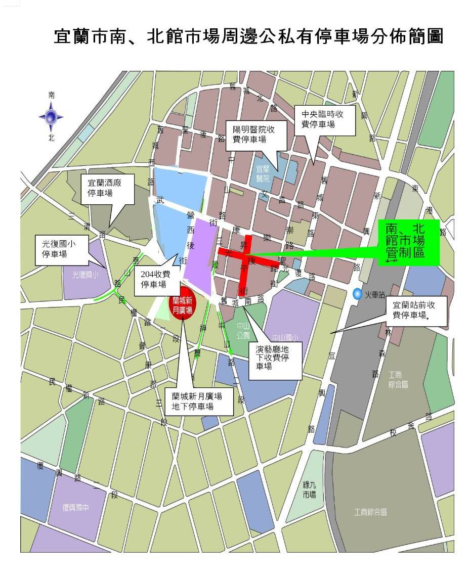宜蘭市南、北館市場周邊公私有停車場分佈圖。