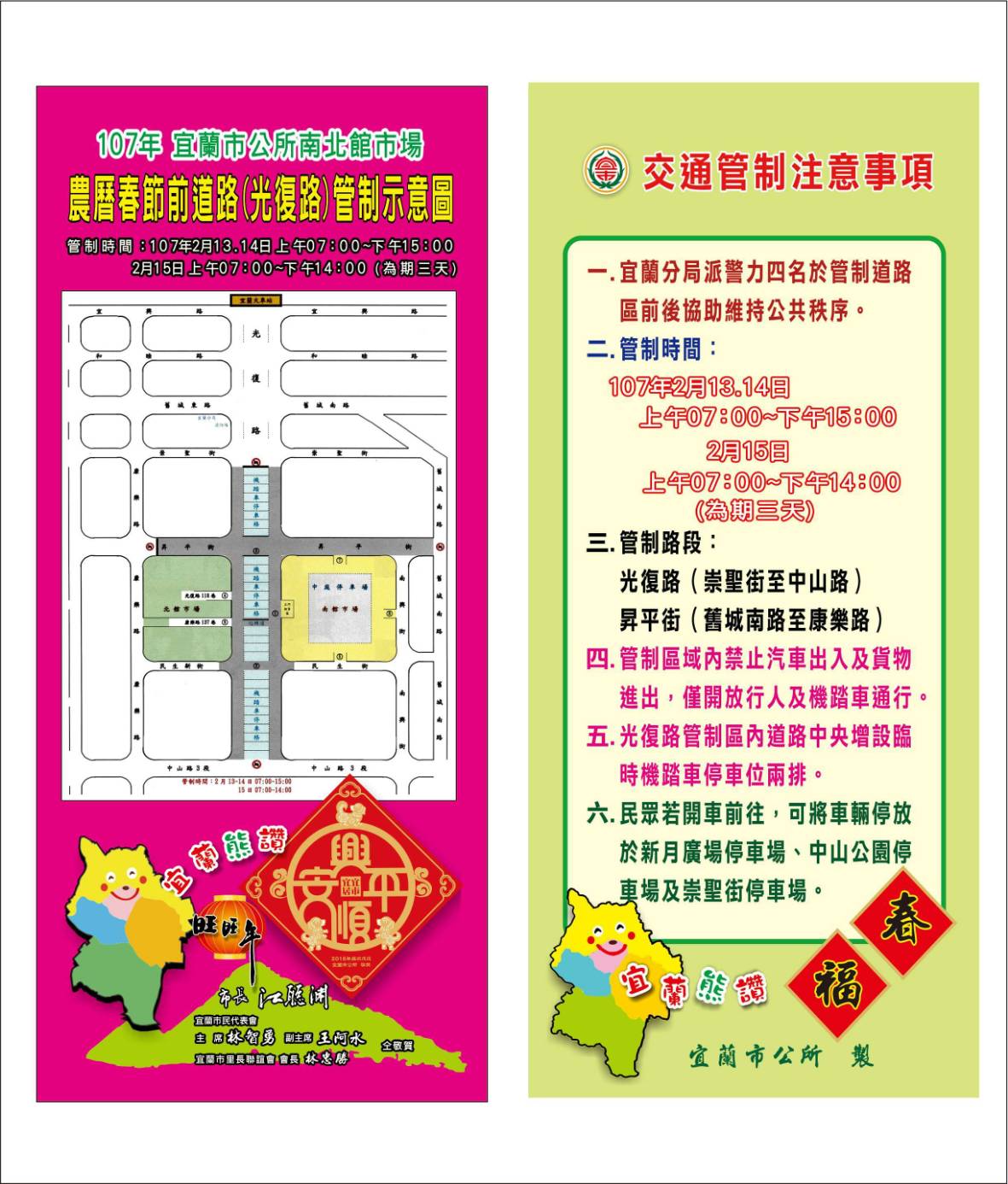 道路管制自107年02月13日(農曆12月28日)起至02月15日(農曆12月30日)止計3天;13、14日自上午07時起至下午15時止,15日自上午07時至下午14時止。