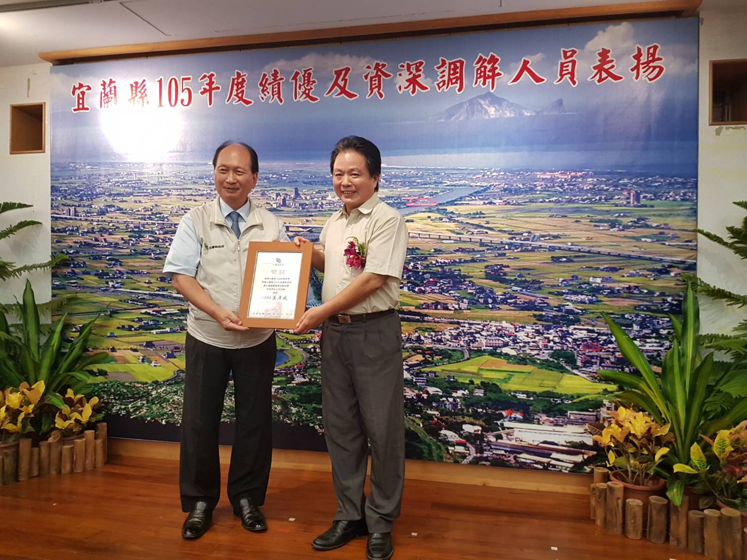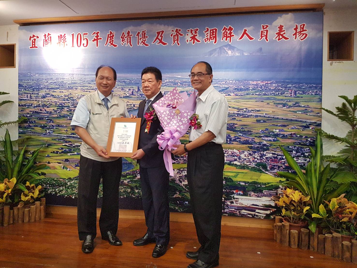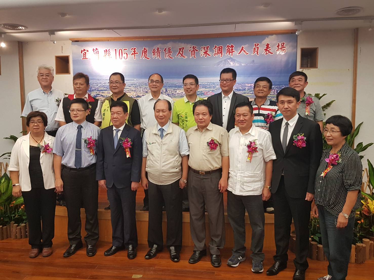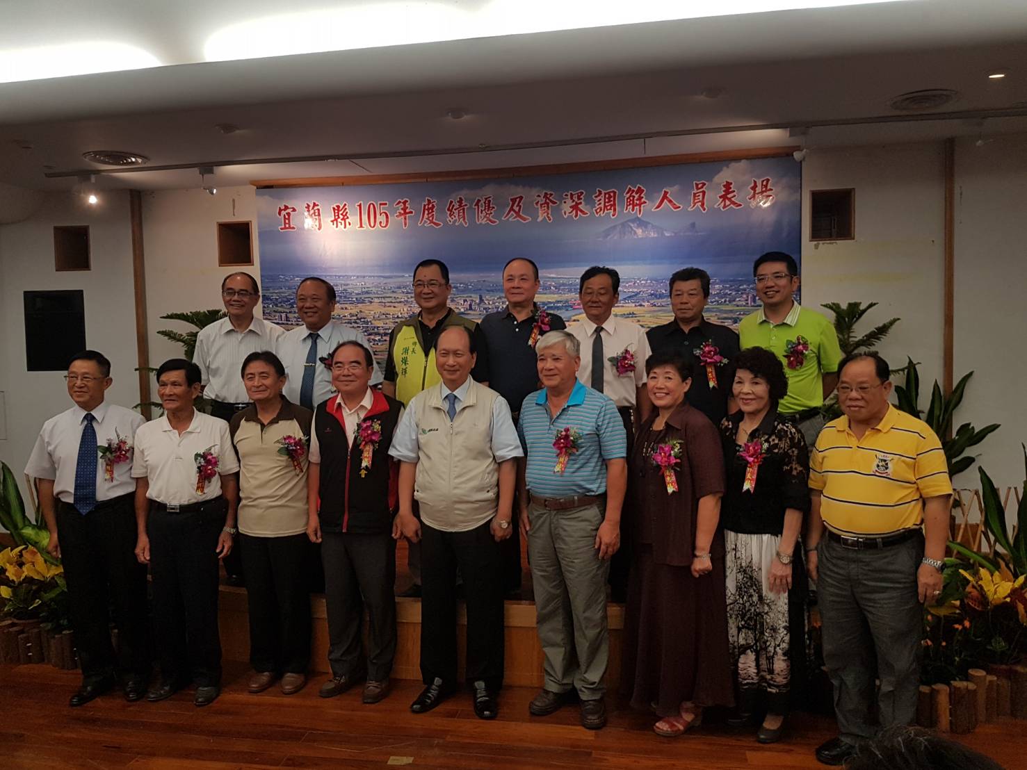 宜蘭縣政府8月15日上午11時在縣府多媒體簡報室辦理「105年度績優及資深調解人員表揚大會」,由吳澤成代理縣長頒獎感謝調解人員的付出與努力。由於各鄉鎮市都有獲獎名單,各地的鄉鎮市長也都到場祝賀,江聰淵市長還特地上台獻花,羅東鎮長林姿妙及東山謝燦輝也特地趕來道賀。