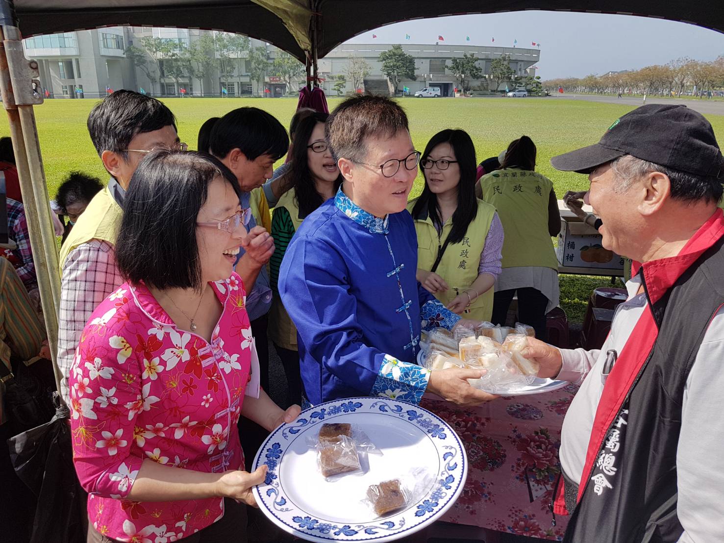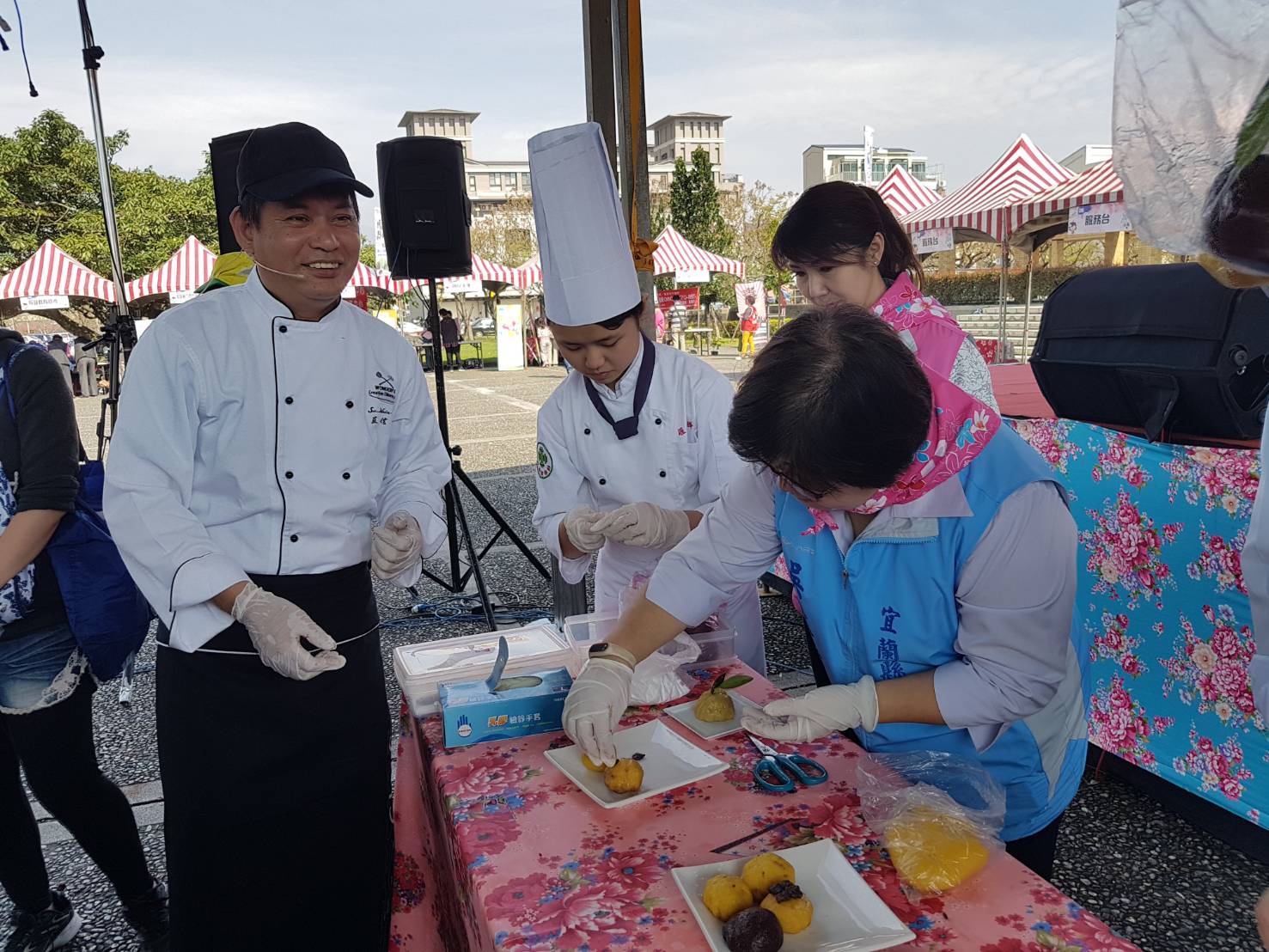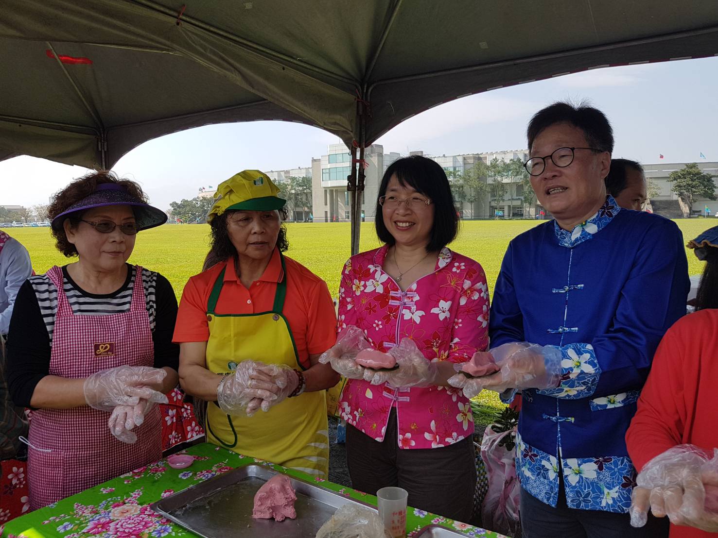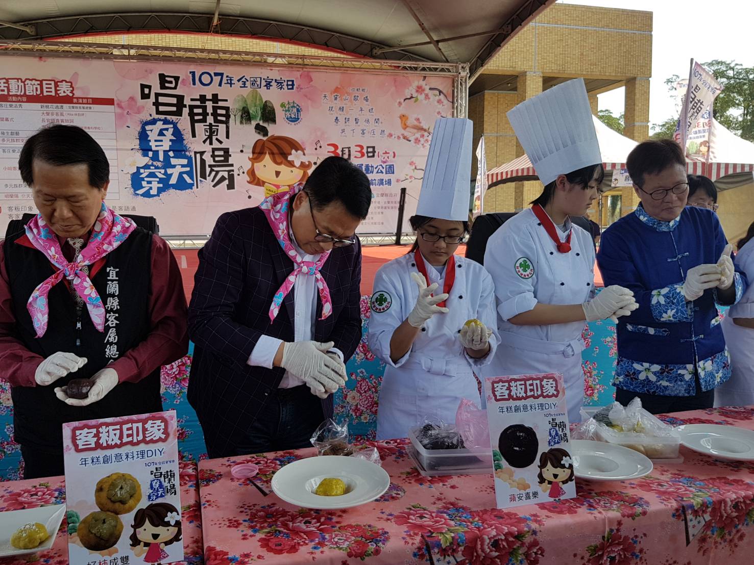 今日宜蘭運動公園熱鬧滾滾,除了有客屬總會以現代改編版客家歌舞劇「新桃花過渡」,緊接著由客家電視台當家主持人Rita林鈺婷,用甜美的嗓音、豐沛的情感、多元的創作帶來耳目一新的客家曲風外,耕莘健康管理學校餐飲科老師蘇信川及學生還指導代理縣長陳金德、立委陳歐珀、客屬總會張永能等人學做創意客家粄,並用蘋果、柿子、桔子的造型「粄」,其象徵祝福「蘋」安喜樂、好「柿」成雙、大「桔」大利。