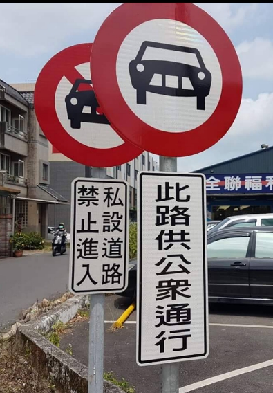 他PO了一張照片,一前一後、相距不到一公尺的兩面號誌,一面寫著”此路供公眾通行“,另一面寫著”私設道路禁止進入”。這交通標誌…到底哪個是對的…?就需要請主管機關來說明…。