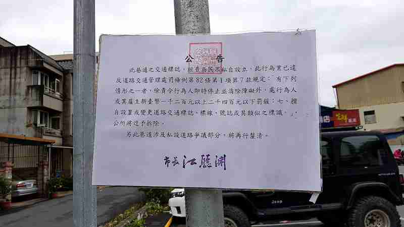 〞此巷道之交通標誌,經查為民眾私自設立,此行為業已違反道路交通管理處罰條例第82條第1項第7款規定:「有下列情形之一者,除責令行為人即時停止並消除障礙外,處行為人或其雇主新臺幣一千二百元以上二千四百元以下罰鍰;七、擅自設置或變更道路交通標誌、標線、號誌或其類似之標識」。公所將逕予拆除,另此巷道涉及私設道路爭議部分,將再行釐清。市長江聰淵。〞
