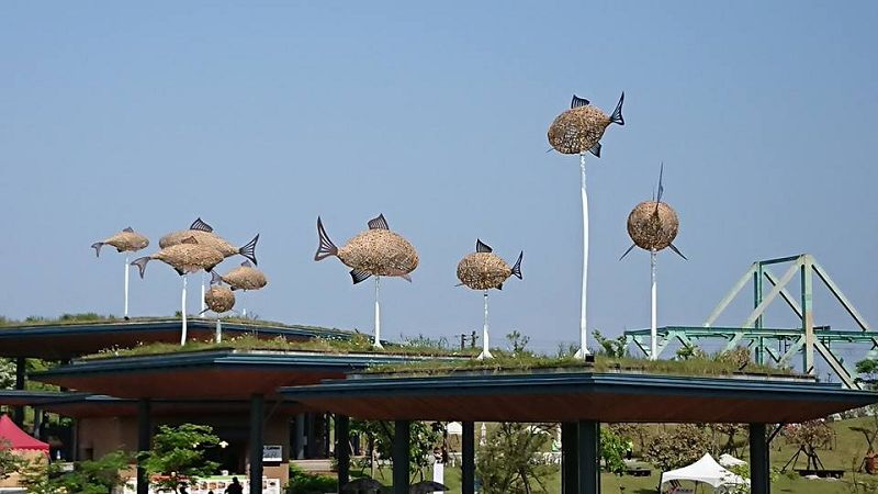 其中「揮汗」、「展翅・飛翔」、「魚群」則是這位藝術家在2018綠博中特別想向大家介紹的3件作品。巨型裝置藝術「揮汗」位於農業實驗學校入口,高度達1,250公分,其結構由農夫偌大的雙手高舉著斗笠,宛若莊子《莊子·讓王》的詩句「日出而作,日入而息,逍遙於天地之間而心意自得」。自古以來,先民尊重大自然的節律而生活,依循時序的變化而揮汗耕種,逐漸地積累成生活智慧。穿越斗笠入口裝置,象徵穿越了時空,走向青農與老農的無毒農業耕作區,傳承古老的耕作智慧。在信步遊歷的過程,體驗與學習從生產到消費,從產地到餐桌,食當令,採當季的綠色消費生活型態,縮短食物里程,減少碳足跡。