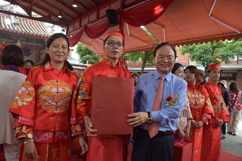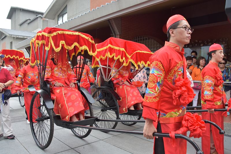 【記者林周龍/宜蘭報導】宜蘭傳藝中心園區,今(23)日特別為集團員工舉辦古式婚禮,共有4對新婚以及4對紀念婚夫妻。熱鬧溫馨的仿古迎親儀式,搭配戲曲與陣頭表演,演繹介紹傳統中的各種禮俗背後代表的意義外,宜蘭傳藝園區也特別致贈新人專屬的禮物包,讓幸福甜蜜延續,也使集團喜上加喜。
