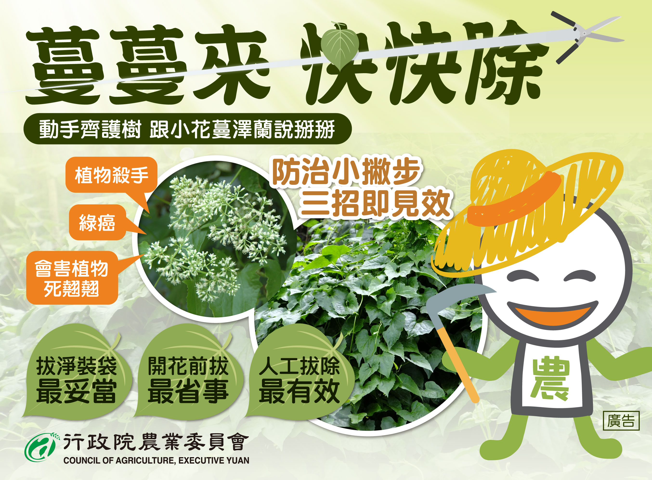夏天是小花蔓澤蘭的生長旺期,至10月底陸續開花結果,因此每年的8/15日至9/15日為小花蔓澤蘭全國防治月,是集結民眾共同防治小花蔓澤蘭的好時機。今年9月2日的防治日活動將集結政府機關、志工及社區民眾協力清除保安林地內的小花蔓澤蘭,有興趣民眾歡迎前往參與,當日現場會準備精美小禮品。