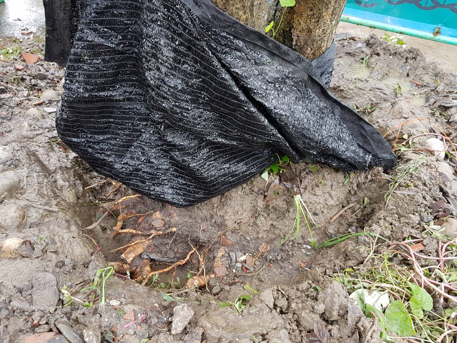 老桂花樹底部細根被不明人士惡意砍斷。(記者邱淑珍/攝)