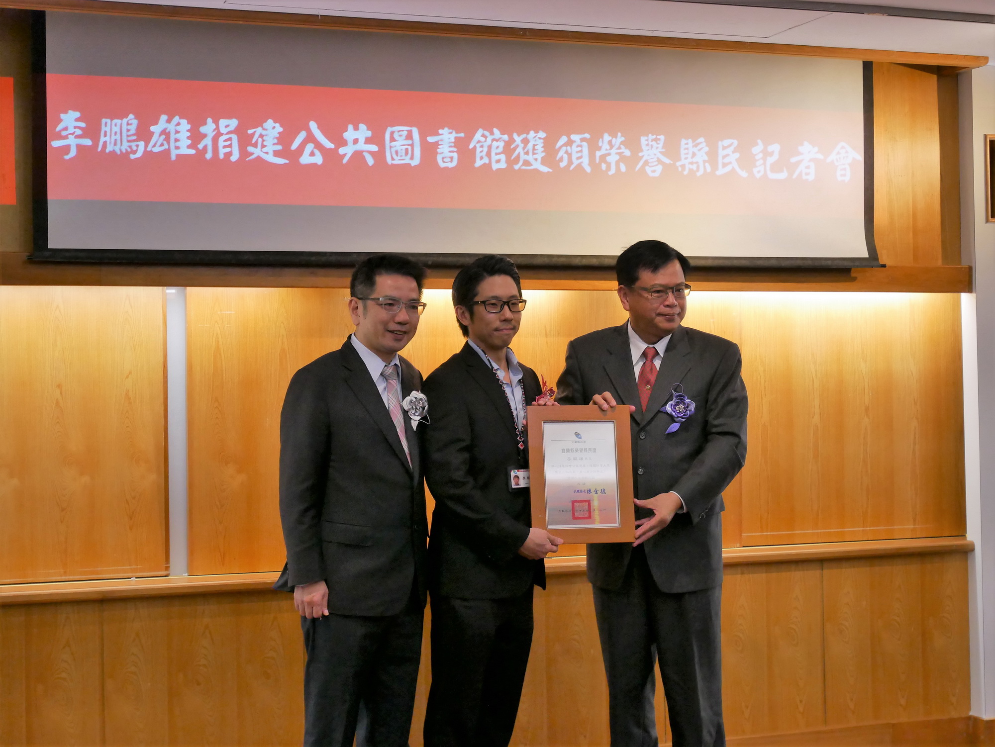 本次頒贈因李鵬雄先生長期閒散於國外,特別由其兒子李振宇先生代為領獎,表達對其文教建設貢獻之謝意。會後由未來圖書館興建及管理單位宜蘭市公所及其建築師說明新館興建理念、設計及後續工期,同時為之後工程對外邀請廠商投標,讓民眾可以期待擁有一座全新圖書館。