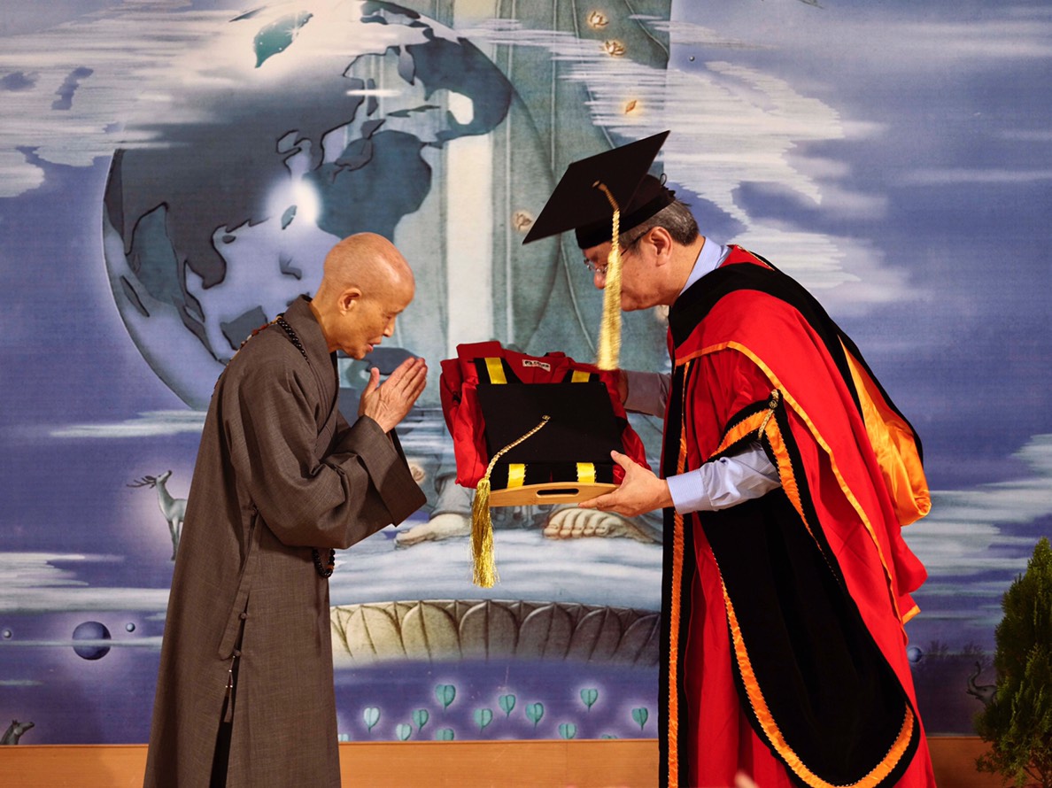 授證典禮由中正大學校長馮展華頒授「名譽文學博士」證書與博士服,證嚴法師親自領受這份榮譽,並回贈象徵「樹人樹德、樂育英才,的「無量心燈」。