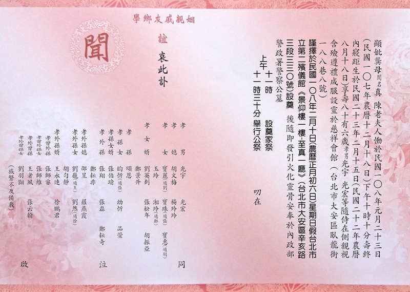 海巡署前副署長龔光宇的母親龔陳真,1月23日過世,享壽86歲,訂今(10)日上午11時30分,在台北市第二殯儀館景仰樓至真一廳舉行公祭,隨即發引安奉於警政署警察公墓。