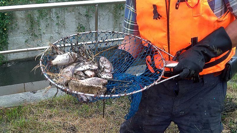 葉慶文村長說,很多農民向新南村長辦公處反映,新興抽水站引水幹道內,水中魚群生態大量死亡。他向宜蘭縣環保局周錫福局長反映,周局長立即橫向聯絡縣政府相關局處處理。這兩天放假,雖是休假期間,宜蘭縣政府水利資源處水利科及環保局技師,馬上作業,將魚浮屍撈起處理,執行力就是強,更是漂亮。