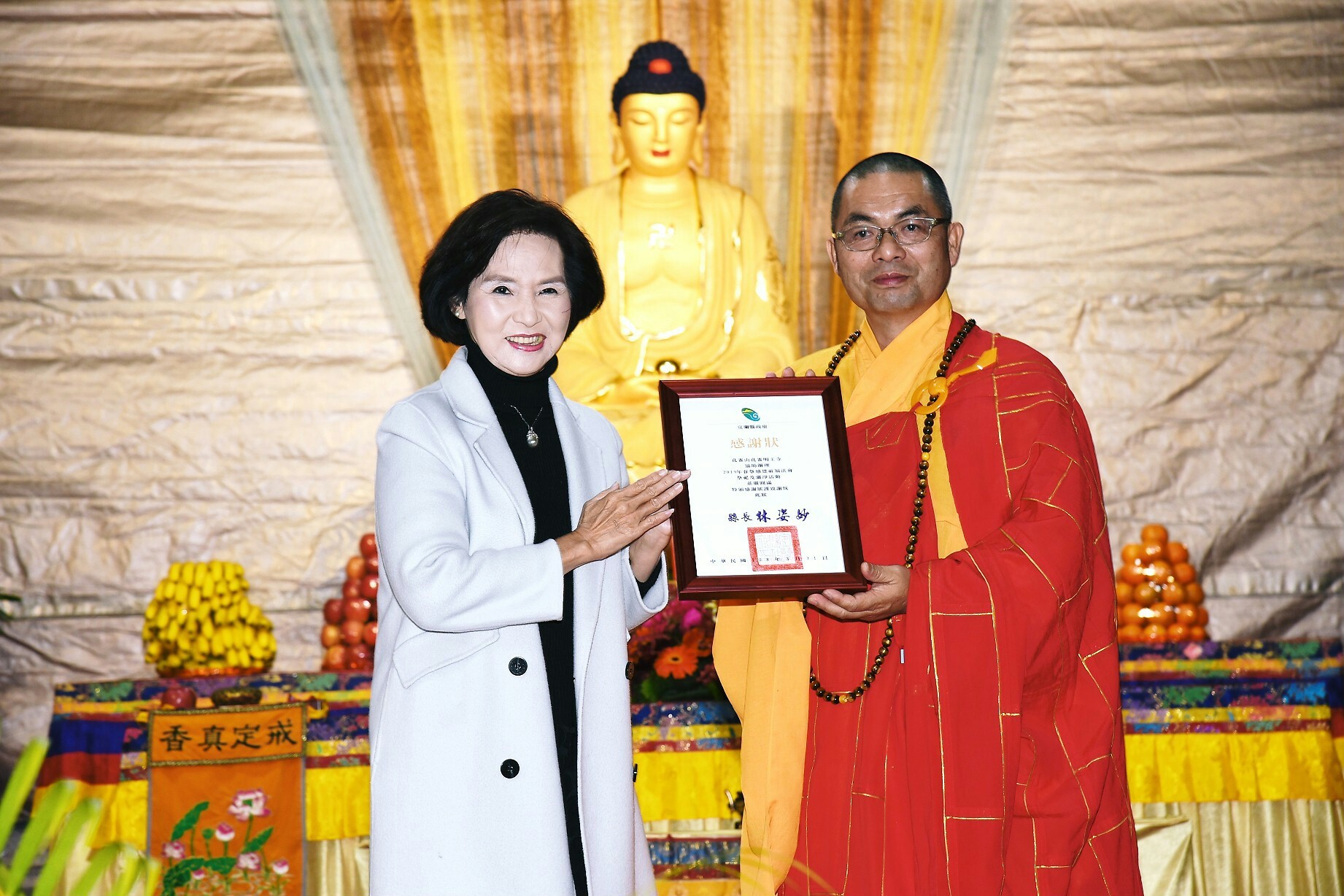 林姿妙縣長致贈感謝狀,由孔雀明王寺慈傑法師代表受贈。