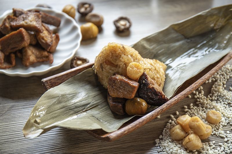 宜蘭傳藝老爺行旅的「麻油松阪珍豬粽」,採用與日本松阪牛同等級美味的宜蘭松阪豬為主角,這塊肉是整頭豬最珍貴的地方,一頭豬的頸部只能取出兩塊,肉質Q彈、有油脂卻不過軟,吃起來有脆感,切塊後更能保有完整性,也能避免內層浸入過多的醬汁,保有更多原本豬肉的香氣或口感,米則是用價格高於一般糯米一倍的池上糯米,這種米的特色是米粒飽滿、Q彈度好、久蒸也不會糊爛。並用整顆干貝切絲均勻攪拌,不僅讓豬肉更提味,也增加鮮美的層次,還有整朵的香菇、栗子等食材,都豐富了肉粽的色、香、味。