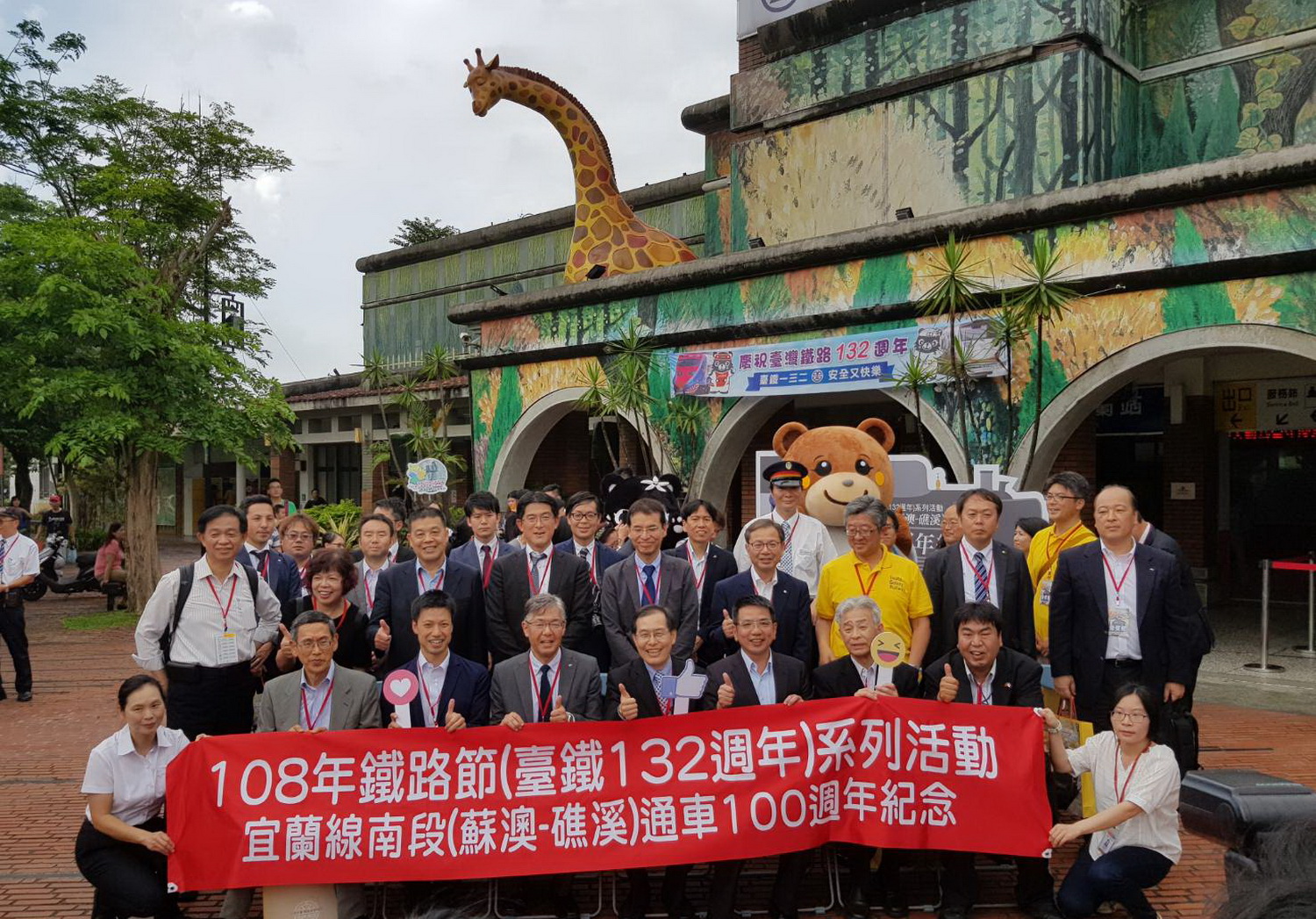 台鐵蒸汽火車載著貴賓至宜蘭火車站,江聰淵市長與貴賓們合影。(照片/記者邱淑珍攝)
