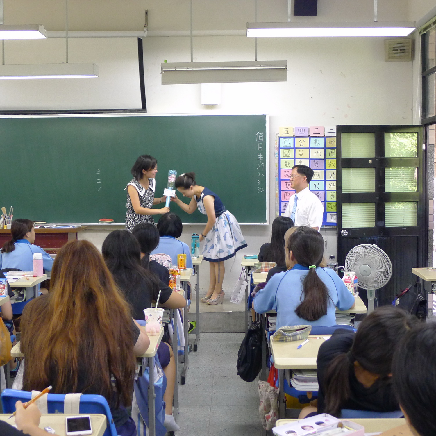 老師就像蠟燭,總是燃燒自己照亮學生,雖然今天是教師節,但老師們仍堅守岡位,為了體恤他(她)們的辛勞與心情,家長會長林淑玲今早9:00就到各班致贈花束,雖然只是一小束鮮花,但已讓老師們感到溫馨,所有的辛勞都值得了。