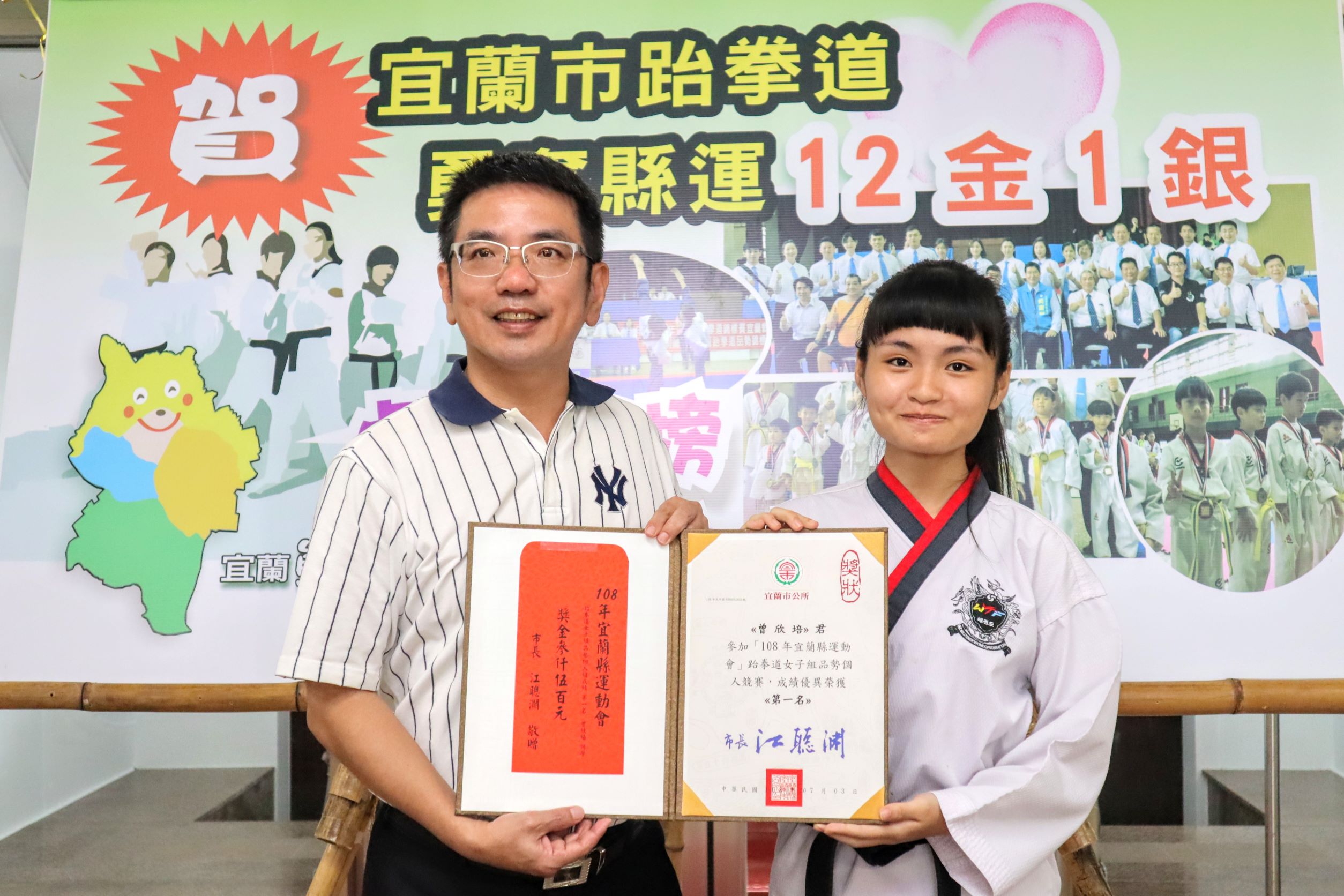 曾欣培,103-108年宜蘭縣運動會對打及品勢兩項,連續5年稱霸第一名,並入選2019年拿坡里世大運培訓隊 ; 温俐婷,國小接觸籃球、田徑及跆拳道,最後在教練曾正公指引下,往跆拳道發展,教練不斷提供支持與鼓勵,高中取得全中運的門票,體育大學畢業至今,一直從事跆拳道教學,培育及訓練更多選手,以達文化傳承。另外,曾正公、林志峰及朱志忠等三位教練,利用下班及假日時間培育選手,沒有他們的付出與因材施教,無法締造12金1銀亮眼成績,功不可沒。
