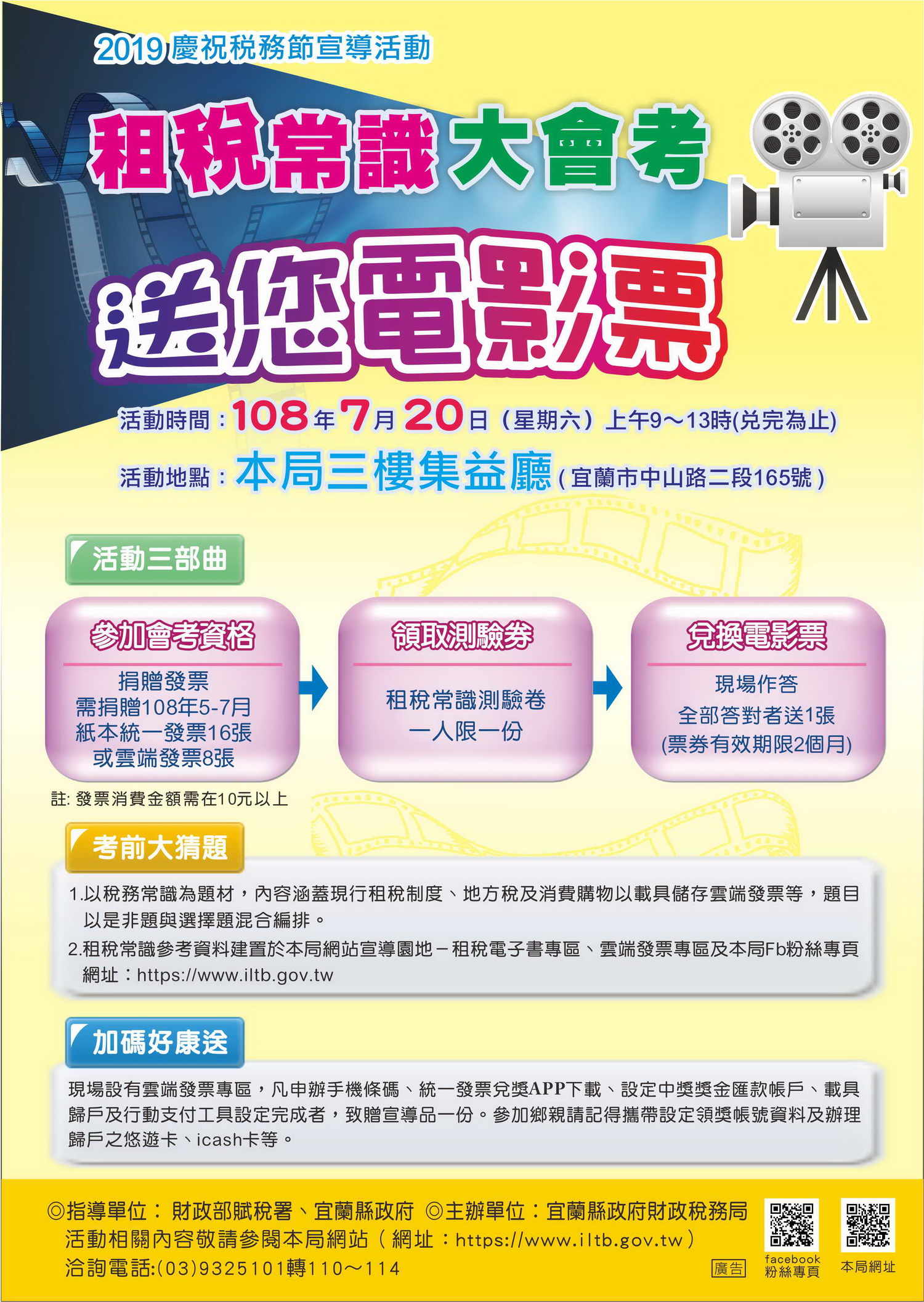 為擴大宣導租稅常識並慶祝一年一度稅務節,宜蘭縣政府財政稅務局將於7月20日上午9~13時在稅務局舉行「租稅常識大會考─送您電影票」宣導活動,歡迎有興趣的鄉親朋友相招來參加。
