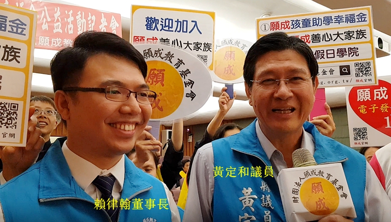 黃定和議員說 ,願成基金會是一個大家族,他們眾志成城、聚沙成塔,幫助我們國家未來的主人翁, 教育是百年大計, 教育的磐石需要我們每個人都付出一點點力量,讓它非常的穩固,那國家社會才會強盛 ,濟弱扶貧的概念落實到每一個角落。