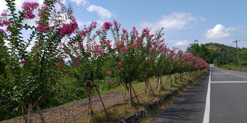 冬山大進社區內的淋漓坑地區具有豐富的自然資源,是渾然天成的自然環境學習場域,在這個季節進入大進社區,首先印入眼簾的,即是入口兩旁盛開的紫薇花;此外,也是在地的農特產─綠竹筍的主要產季(每年5月至10月)。