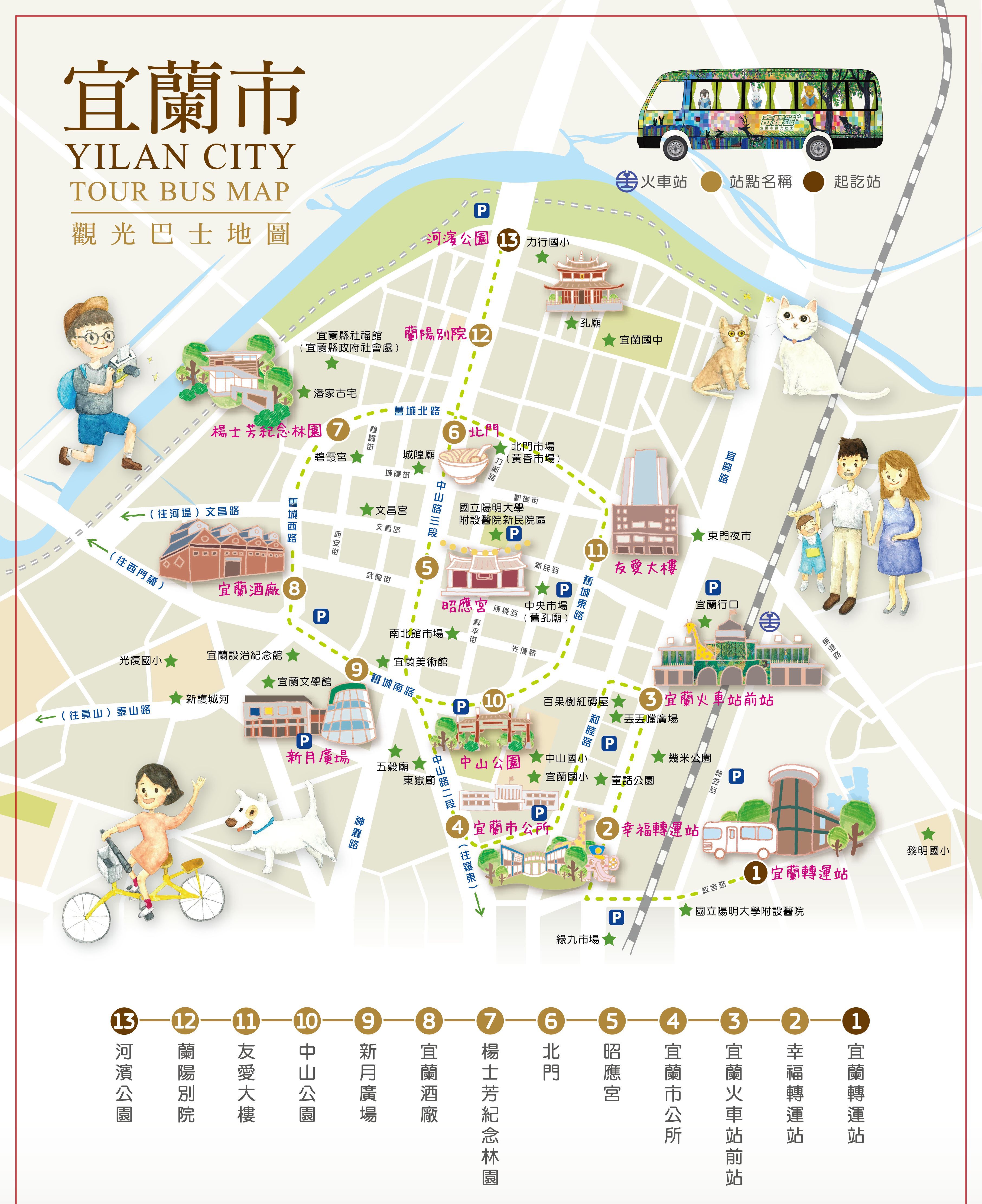 想要暢遊宜蘭舊城嗎?宜蘭幾米觀光巴士載您去!只要在搭乘前先預約,並提供搭乘人數、姓名、電話、搭乘起訖站點及時刻等,觀光巴士就會免費帶您暢遊宜蘭。
