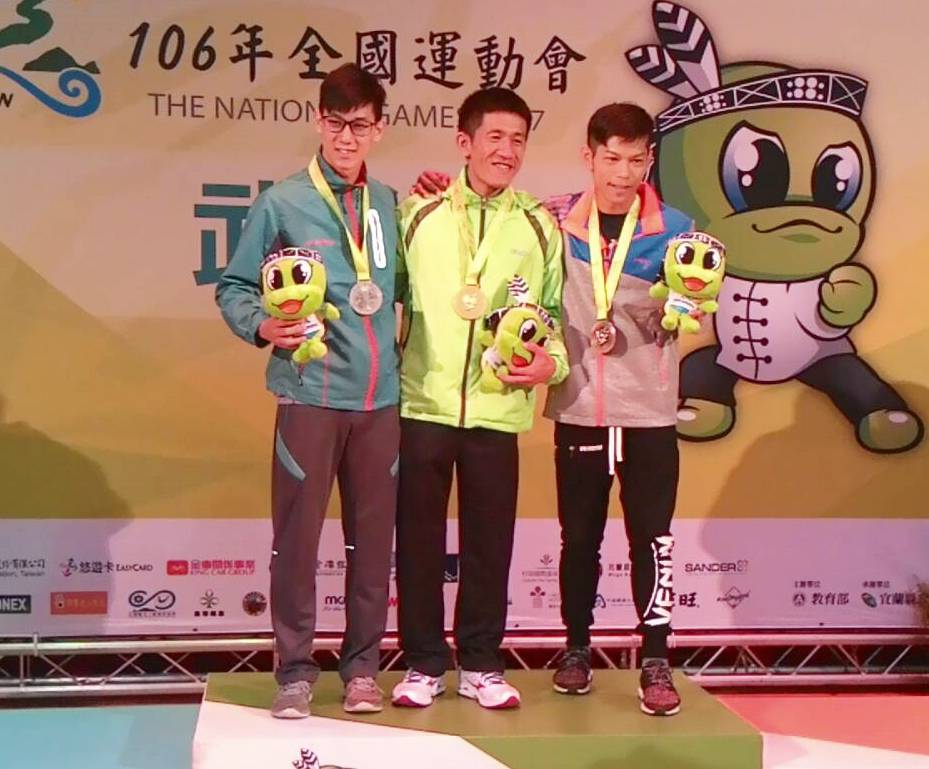 男子組武術65公斤(左起)台中蔡奕賢(銀)、宜蘭劉鑑霆(金)、嘉義蔡昇諭(銅)。(照片/大會提供)