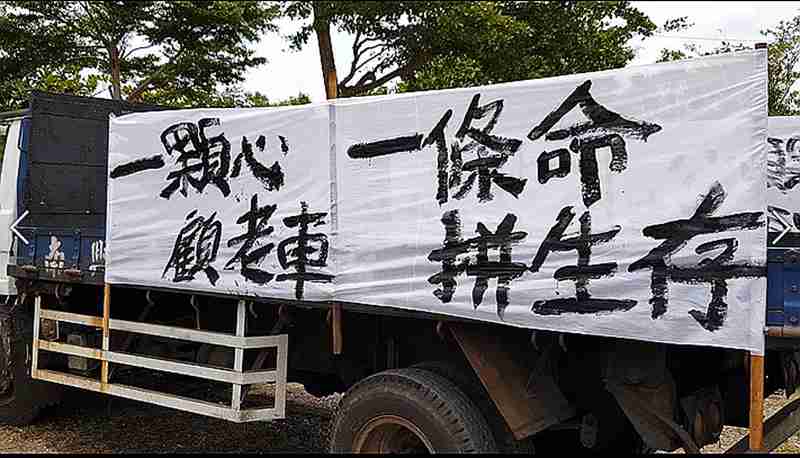 另外一位基隆的卡車車主,清晨6時許,就從基隆趕到宜蘭,就以自己準備的筆墨在白布條上寫著──「一顆心顧老車;一條命拼生存」。簡潔有力。