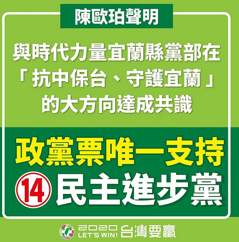 時代力量宜蘭黨部和民進黨立委候選人陳歐珀簽署合作,時代力量在宜蘭支持陳歐珀 ,隨後時代力量推出一張圖卡,在簽署照片加上文字~政黨票支持時代力量。導致陳歐珀趕緊發聲明,呼籲政黨票還是要投給民進黨。