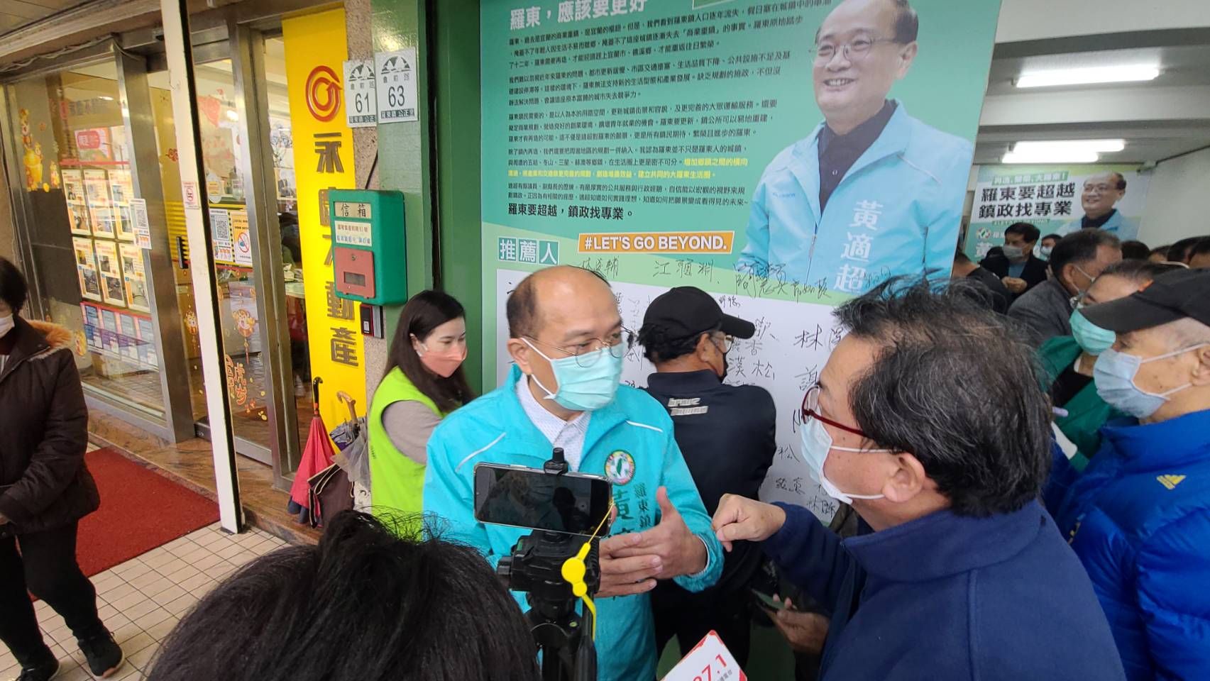 在場支持民眾在主持人帶動下,齊聲支持黃適超而喊口號:為羅東拚鎮長、黃適超當選!