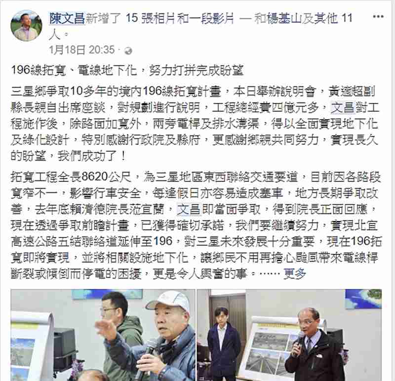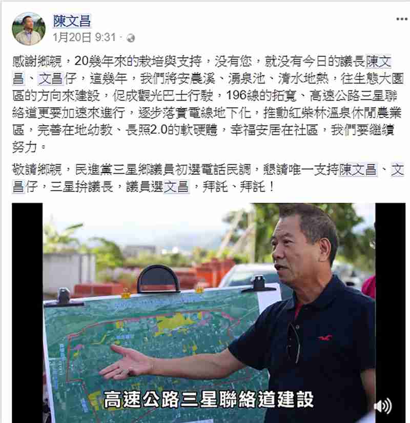 感謝鄉親,20幾年來的栽培與支持,没有您,就没有今日的議長陳文昌、文昌仔,這幾年,我們將安農溪、湧泉池、清水地熱,往生態大園區的方向來建設,促成觀光巴士行駛,196線的拓寬、高速公路三星聯絡道更要加速來進行,逐步落實電線地下化,推動紅柴林溫泉休閒農業區,完善在地幼教、長照2.0的軟硬體,幸福安居在社區,我們要繼續努力。